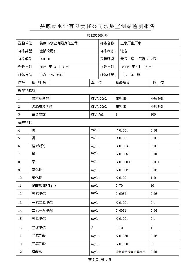 2025年3月三水廠出廠水水質(zhì)公告
